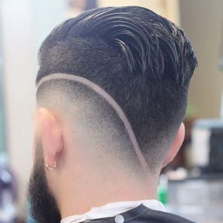 If you like unique styles, you will be pleased with this quite original haircut. The top section of the fade is outlined by stripes and the top part is arranged into a neat pompadour. Such hairstyle is great for special occasions.